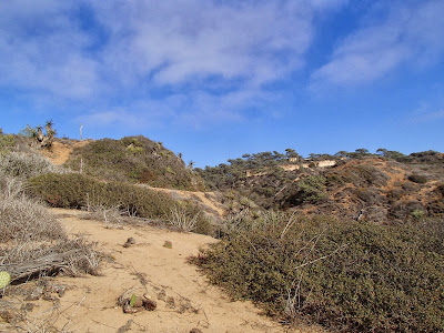 Today I visited Torrey Pines State Natural Reserve in Del Mar/La Jolla. I drove past/through/around it a couple of times, because the entrance was cleverly hidden behind a car park giving access to the beach. People had been telling me it's the #1 nature spot in San Diego, and I well believe it. Somewhere I read the word 'wilderness,' and brought a full pack, thinking I might get some hiking done. Once I got there, it was apparent that this was not that place, so I repacked a litre of water into the 20 litre day pack I carry for emergencies (it packs down into about 10cc, and would carry water nicely) and joined a volunteer-guided walk focusing on the vegetation and ecosystem of maritime chaparral.